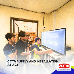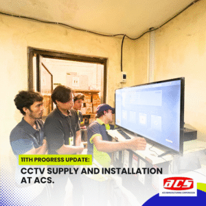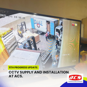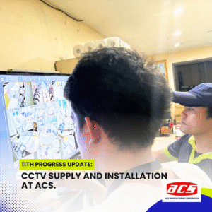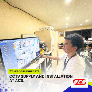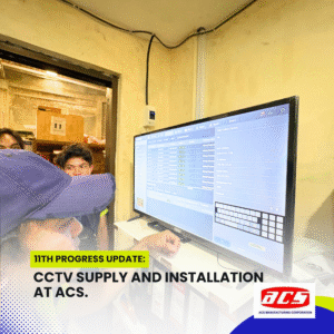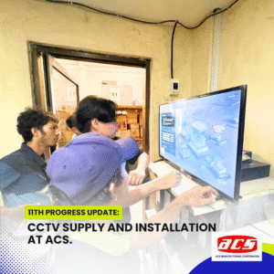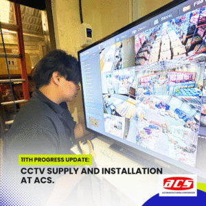 The CCTV supply and installation project at ACS Manufacturing Corporation has reached a highly anticipated milestone—a full test run of the surveillance system. With all bullet-type cameras installed, Cat6 cabling in place, and the network infrastructure fully assembled, our team conducted a live demonstration of the system’s functionality, using the NVR and PoE switch setup connected to a TV monitor.