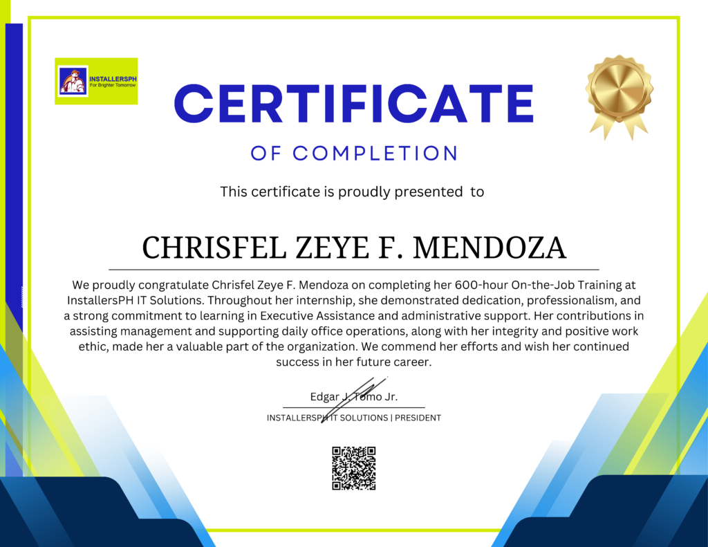 Chrisfel’s OJT experience at InstallersPH IT Solutions provided her with valuable exposure to executive assistance and financial operations. Her contributions to administrative support and audit-related tasks made her a valuable part of the organization. By successfully completing her training, she proved her readiness to pursue future opportunities in the field of Financial Management and professional administration.