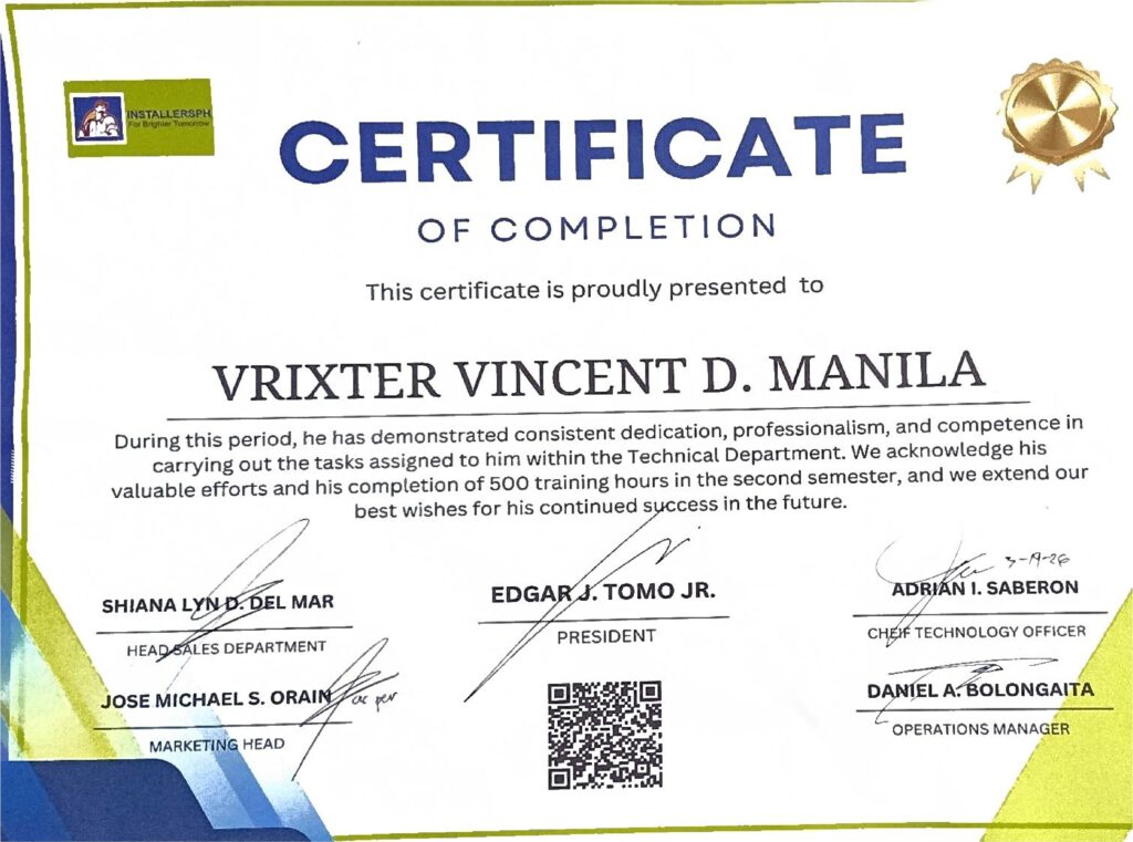 The successful completion of the On-the-Job Training program marks an important achievement in Vrixter’s academic and professional journey. Through this experience, he has gained valuable knowledge, developed practical skills, and strengthened his work ethic. With the awarding of his Certificate of Completion, we recognize his accomplishment in completing 500 training hours and commend him for his dedication throughout the program. We extend our sincere congratulations and best wishes to Vrixter Vincent D. Manila as he continues to pursue success in his future career and professional endeavors.